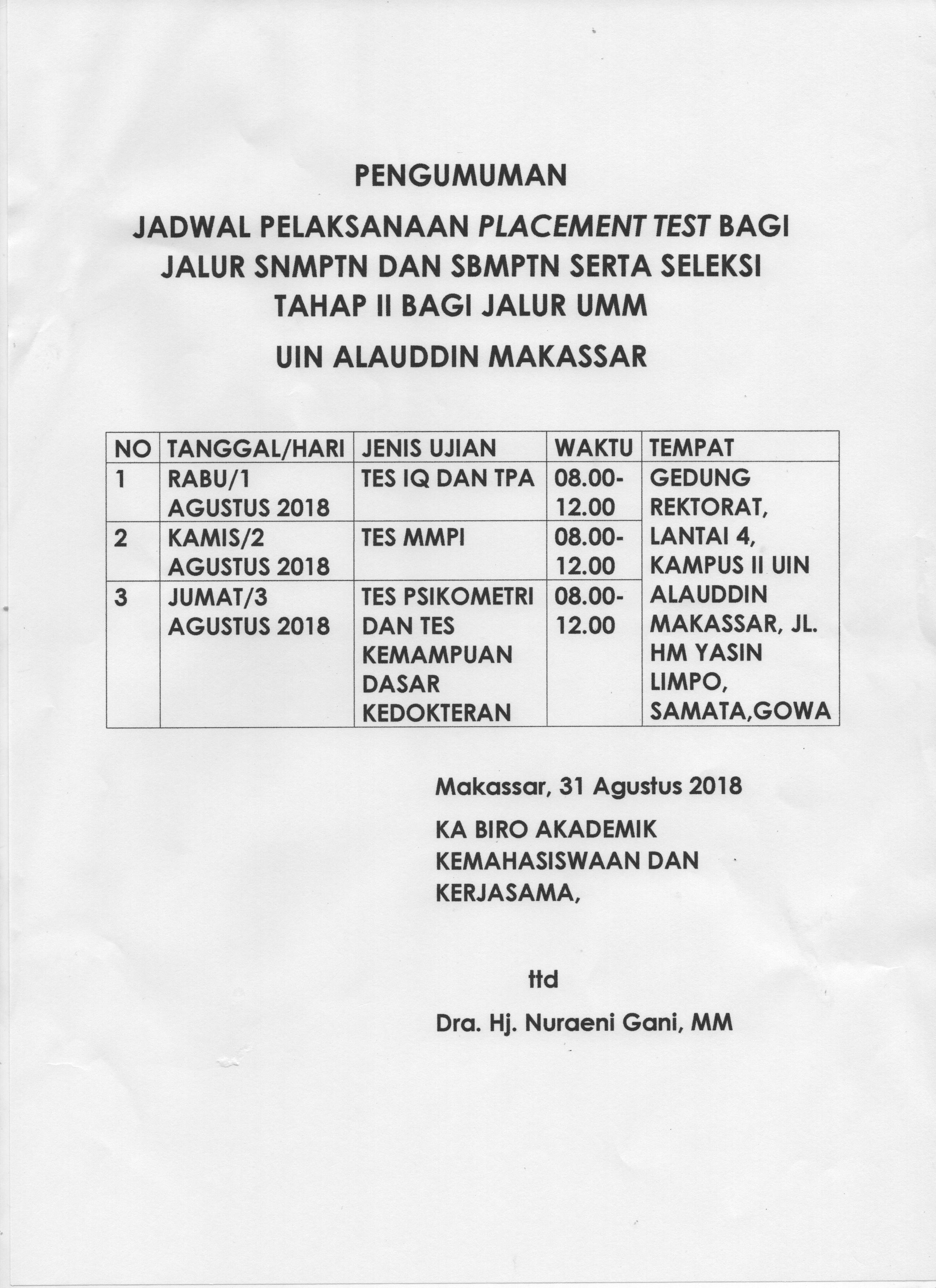 Jadwal Pelaksanaan Placement Test Bagi Jalur SNMPTN dan SBMPTN Serta Seleksi Tahap II Bagi Jalur UMM UIN Alauddin Makassar