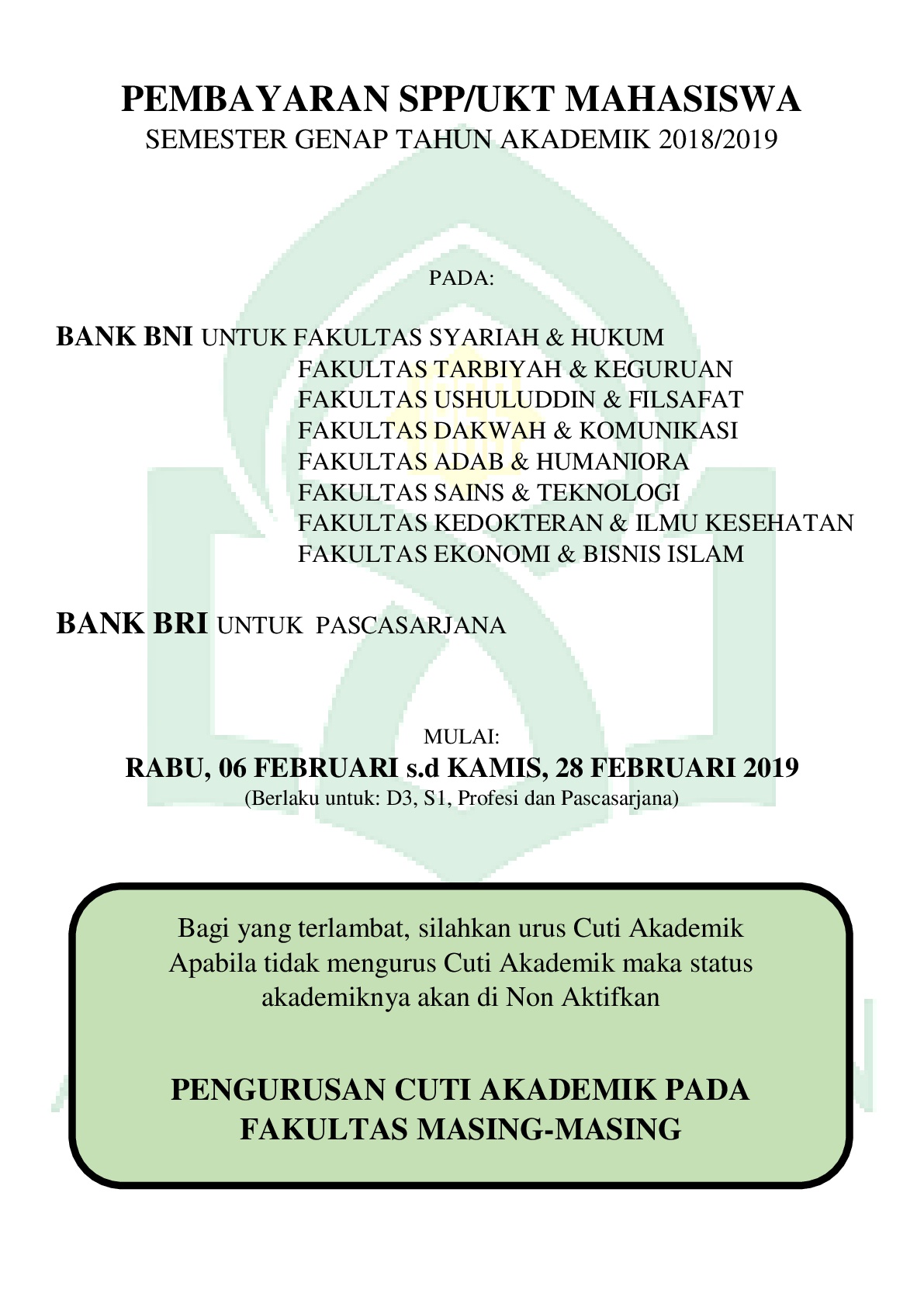 Bagi yang terlambat membayar, silahkan urus Cuti Akademik Apabila tidak mengurus Cuti Akademik maka status akademiknya akan di Non Aktifkan
