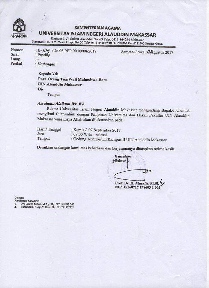 Kepada Yth. Para Orang Tua/Wali Mahasiswa BaruUIN Alauddin MakassarDi TempatAssalamu Alaikum Warahmatullahi WabarakatuhRektor Universitas Islam Negeri Alauddin Makassar Mengundang Bapak/Ibu Untuk Mengikuti Silaturahim dengan Pimpinan Universitas dan Dekan Fakultas UIN Alauddin Makassar Yang Insya Allah akan dilaksanakan pada :