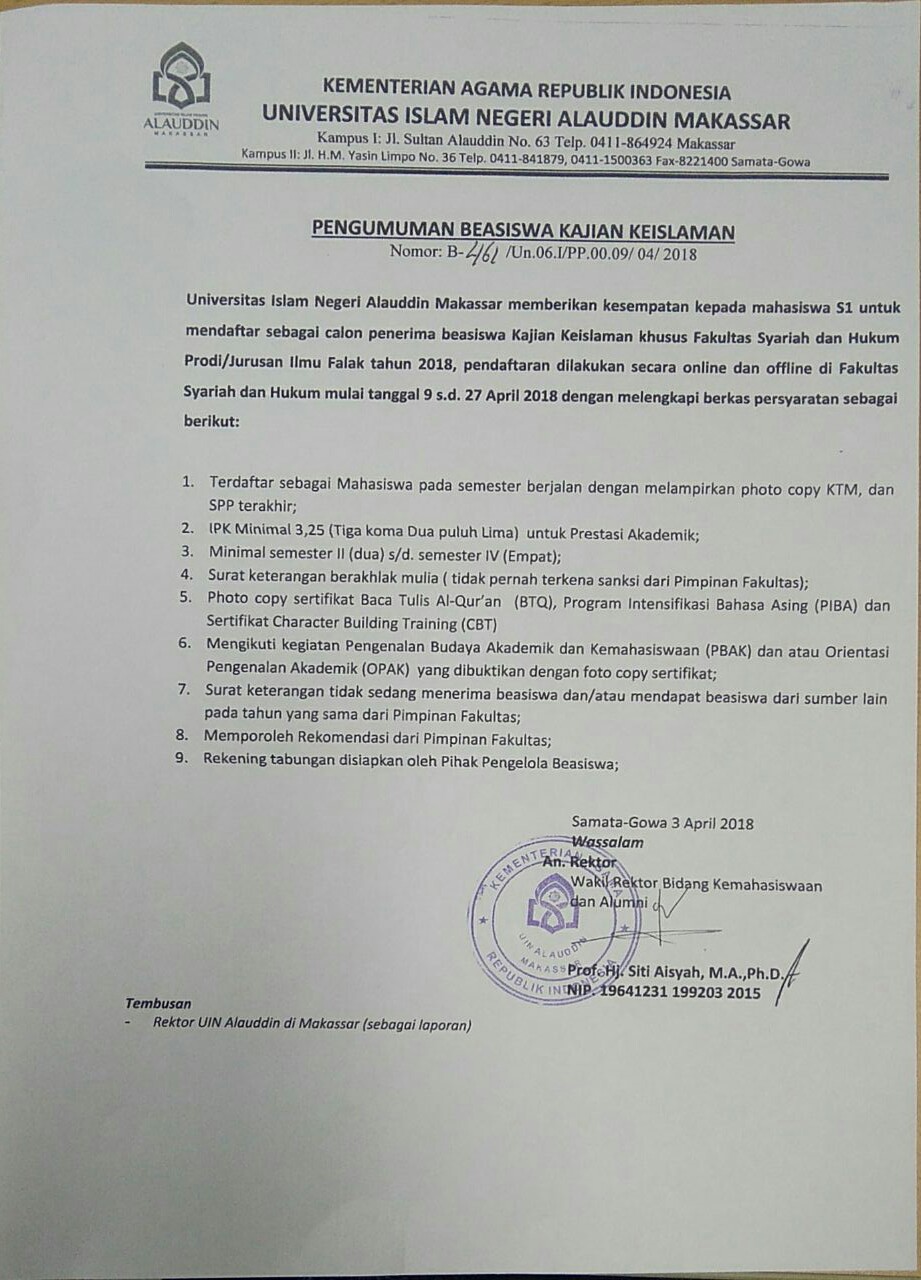 Universitas Islam Negeri Alauddin memberikan kesempatan kepada mahasiswa S1 untuk mendaftar sebagai calon penerima beasiswa kajian keislaman khusus fakultas syariah dan hukum prodi/jurusan ilmu Falak tahun 2018, pendaftaran dilakukan secara online dan offline di fakultas syariah dan hukum mulai tanggal 9 s.d 27 April.