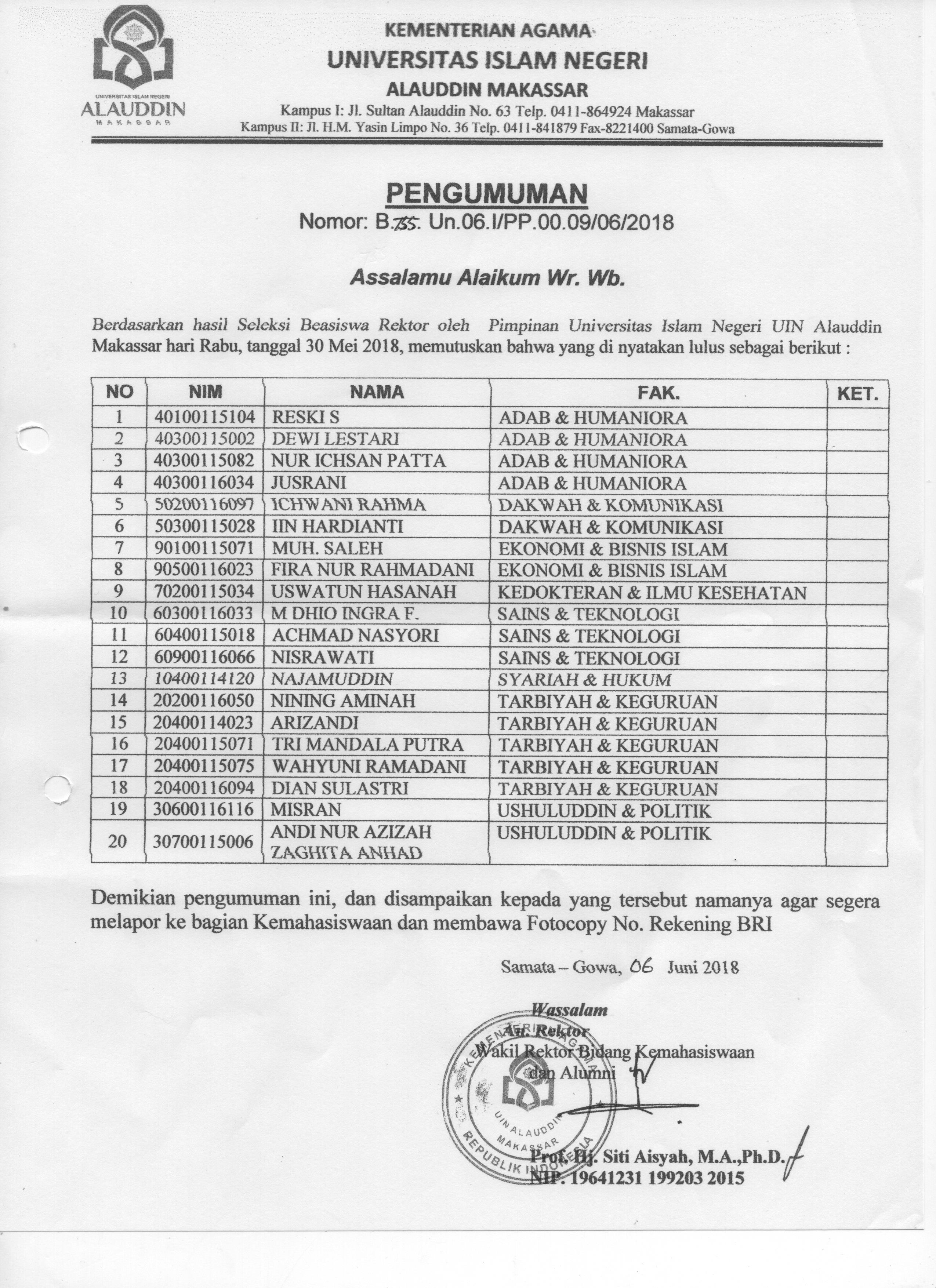 Assalamu alaikum Wr. Wb.Berdasarkan Nomor Surat B.755. Un.06.I/PP.00.09/06/2018 memutuskan mahasiswa yang dinyatakan lulus beasiswa Rektor 2018 sesuai hasil seleksi oleh Pimpinan Universitas Islam Negeri Alauddin Makassar hari rabu tanggal 30 Mei 2018.