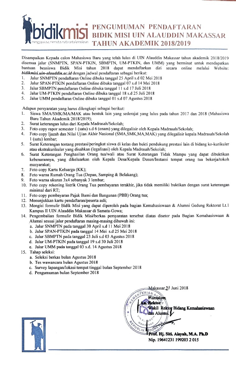 Disampaikan Kepada calon Mahasiswa Baru yang telah lulus di UIN Alauddin Makassar tahun akademik 2018/2019 disemua jalur (SNMPTN, SPAN-PTKIN, SBMPTH, UM-PTKIN, dan UMM) yang berminat untuk mendapatkan bantuan beasiswa Bidik Misi tahun 2018 dapat mendaftarkan diri secara online melalui Website: bidikmisi.uin-alauddin.ac.id dengan rincian pada link berikut ini.