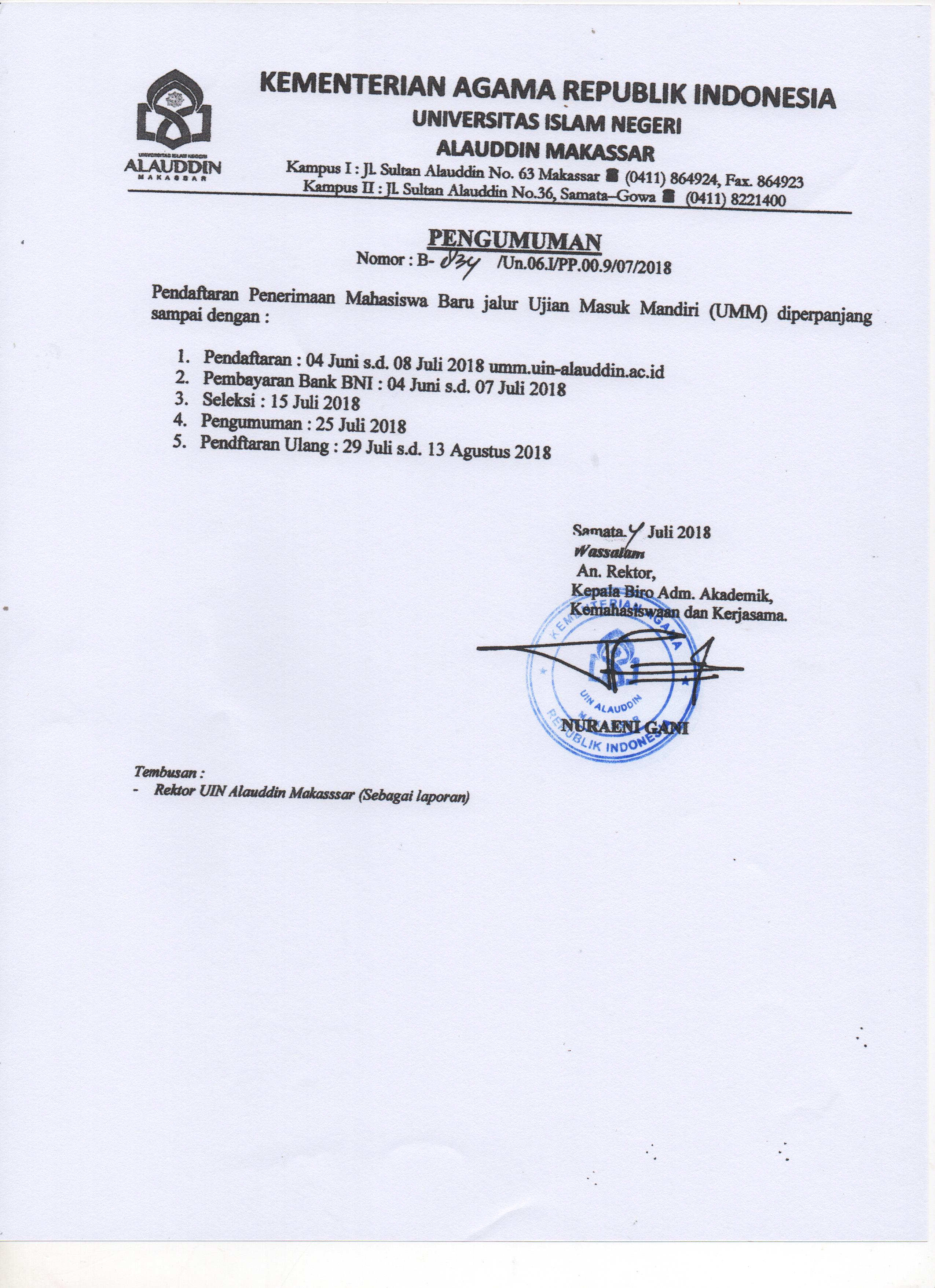 Pendaftaran Penerimaan Mahasiswa Baru Jalur Ujian Masuk Mandiri (UMM) diperpanjang sampai dengan (lihat di lampiran).