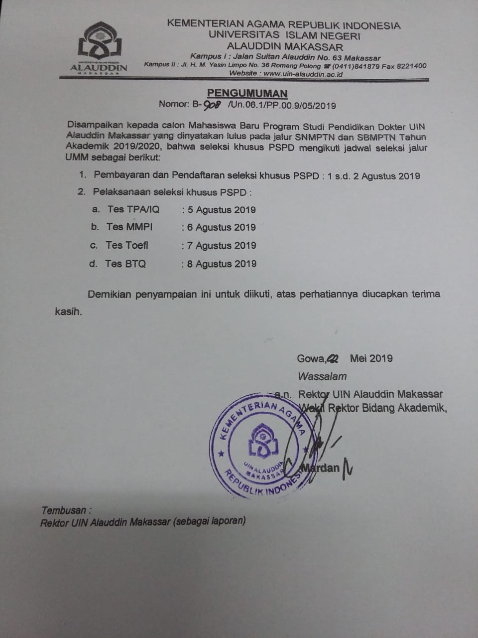 Disampaikan kepada calon Mahasiswa Baru Program Studi Pendidikan Dokter UIN Alauddin Makassar yang dinyatakan lulus pada jalur SNMPTN dan SBMPTN Tahun Akademik 2019/2020, bahwa seleksi khusus PSPD mengikuti jadwal seleksi jalur UMM1. Untuk calon mahasiswa baru jalur afirmasi geografis, menyiapkan MOU antara FKIK dengan Bupati asal calon maba2. Jadwal tes khusus jalur kedokteran (jadwal terlampir)