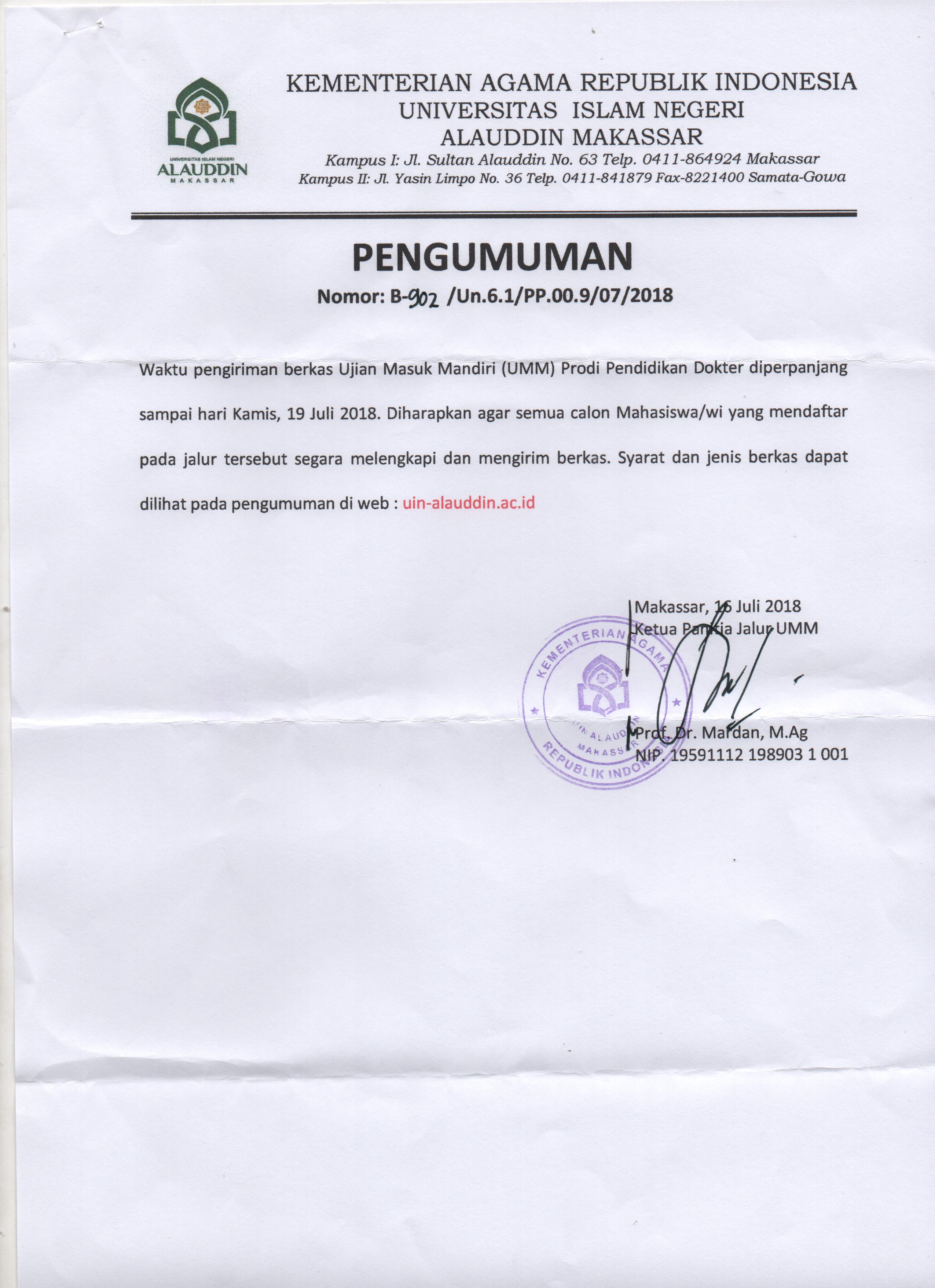 Waktu pengiriman berkas Ujian Masuk Mandiri (UMM) Prodi Pendidikan Dokter diperpanjan sampai hari kamis 19 Juli 2018. (file terlampir)